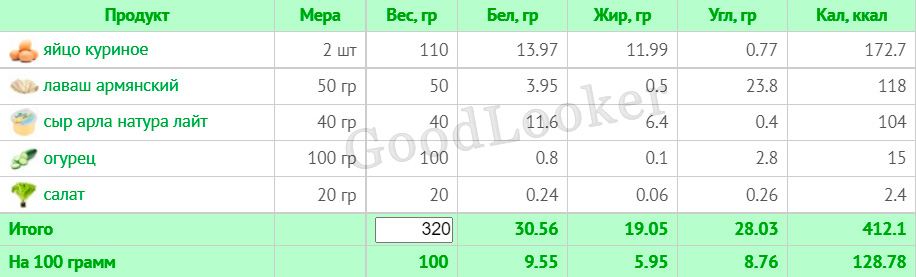 Сніданок: Курячі яйця – 2 шт., армянський лаваш – 50 г, нежирний сир – 40 г, огірок – 100 г, салатне листя – 20 г. Яйця збити та виливати на підігріту сковороду (додати сіль і спеції за бажанням). Коли яйця підсмажаться, накрити їх лавашем, перевернути. На готову страву викласти сир, огірок і салат, згорнути все навпіл. Обсмажити з обох боків. Подавати разом з кавою або чаєм.